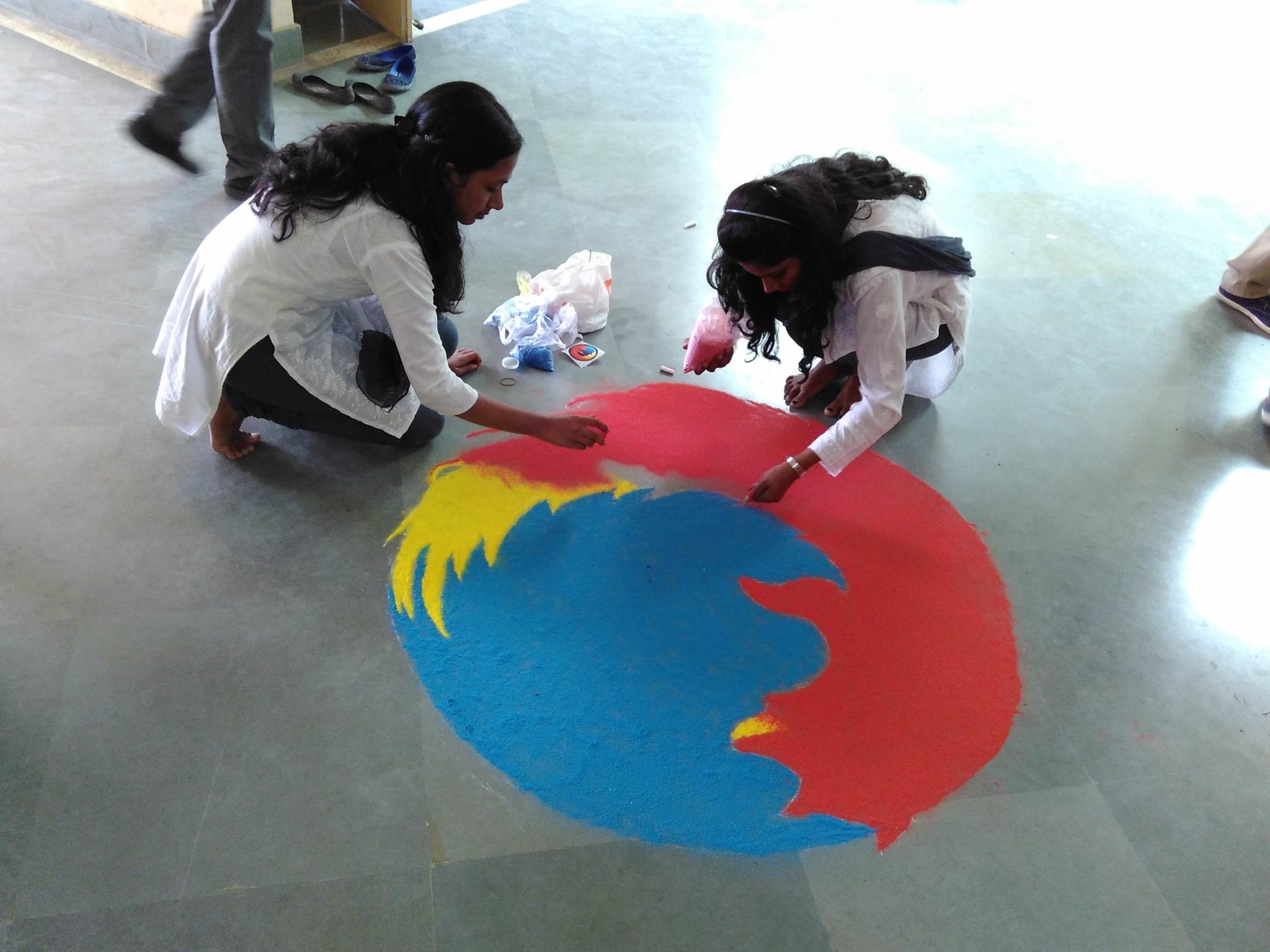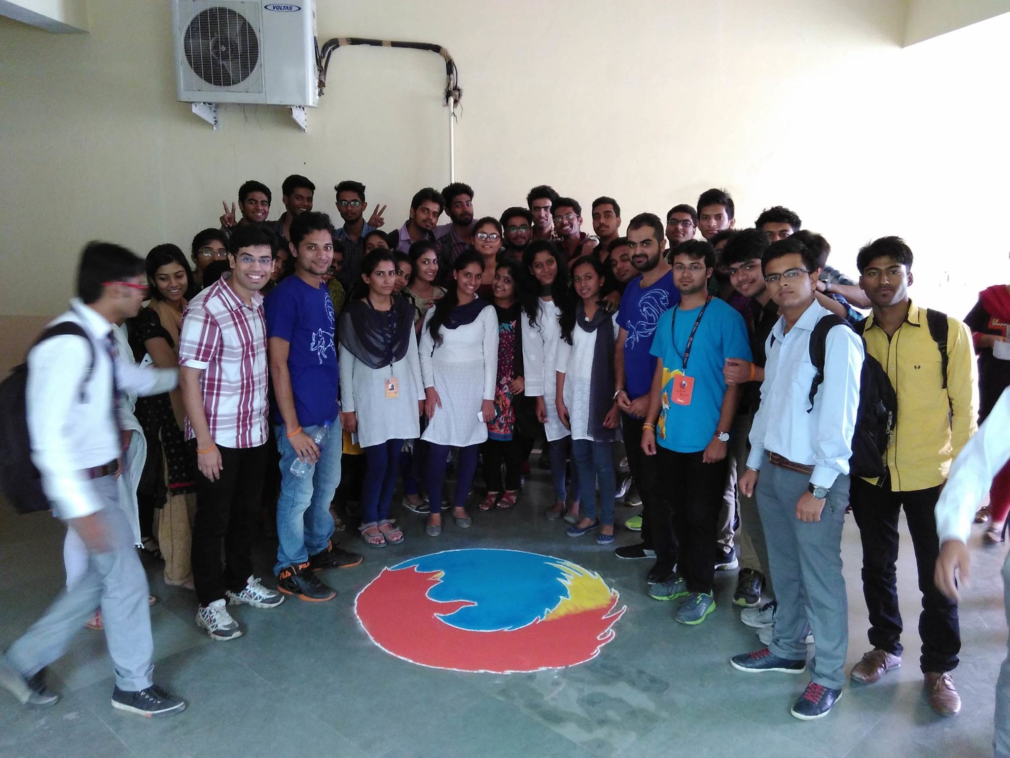 Since i need to make all the arrangements i moved out of the hall, and checked the whole arrangements. When i returned back it was almost the end of the session, I asked the Mozilla team to come to take the lunch. When we came out of the hall there was a fabulous Rangoli of the Firefox logo made by Aayushi Saxena and Mitali Kawale, we had a group photograph with all the attendees.
