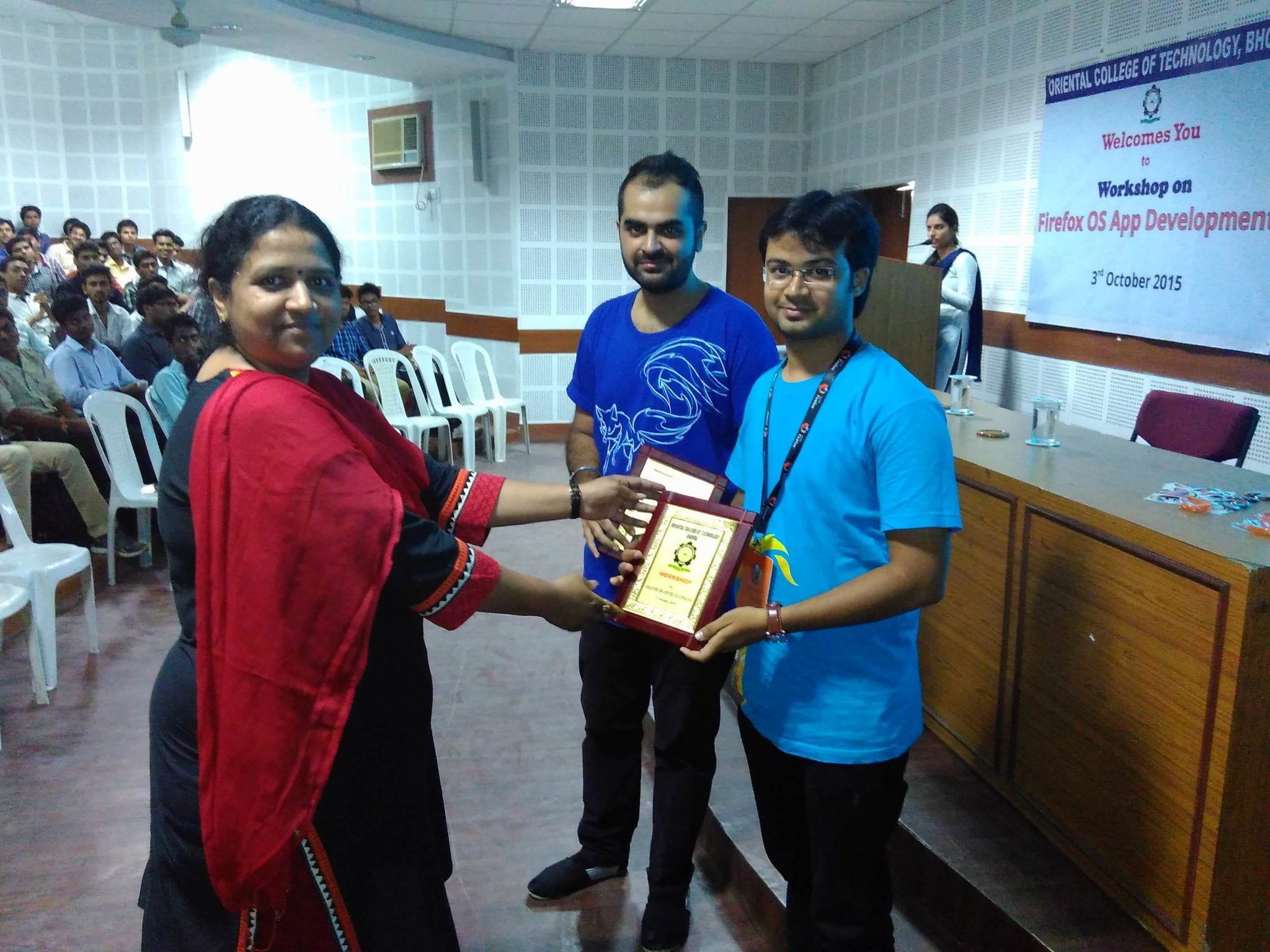 This blog post is about the event conducted at Oriental College of Technology, Bhopal, on 3rd October 2015. On 2nd October’s night i couldn’t sleep for the whole night as there was an event on the next day and i was the person who was responsible to take care of everything, i took the banners, ID cards of the club members and all the necessary things and reached the college around 8.45, i met all the club members and ask them to prepare the labs by  installing and testing simulator in firefox (which is needed for app testing) on each computer. I then went to receive the Speaker cum RePs (Mr Rahul Talreja and Mr Vaibhav Bajaj) with Vidit Sharma and Satyadeep on behalf of the Oriental family, at the same time my team was arranging everything needed to be done so as to proceed with the event.